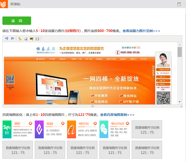 設(shè)置自動(dòng)優(yōu)化:自動(dòng)優(yōu)化讀取“商機(jī)行業(yè)匹配”分組,英雄帖自動(dòng)優(yōu)化是以商機(jī)行業(yè)匹配分組進(jìn)行優(yōu)化。優(yōu)化限圖片插入,不可插入文字,會(huì)影響已有排名,可以說服力圖片范例進(jìn)行優(yōu)化圖片再上傳優(yōu)化。設(shè)置成功,自動(dòng)針對(duì)分組商機(jī)信息自動(dòng)插入5~10張優(yōu)化圖片和優(yōu)化過的百度縮略圖,頁面美觀,大大提升流量轉(zhuǎn)化率。